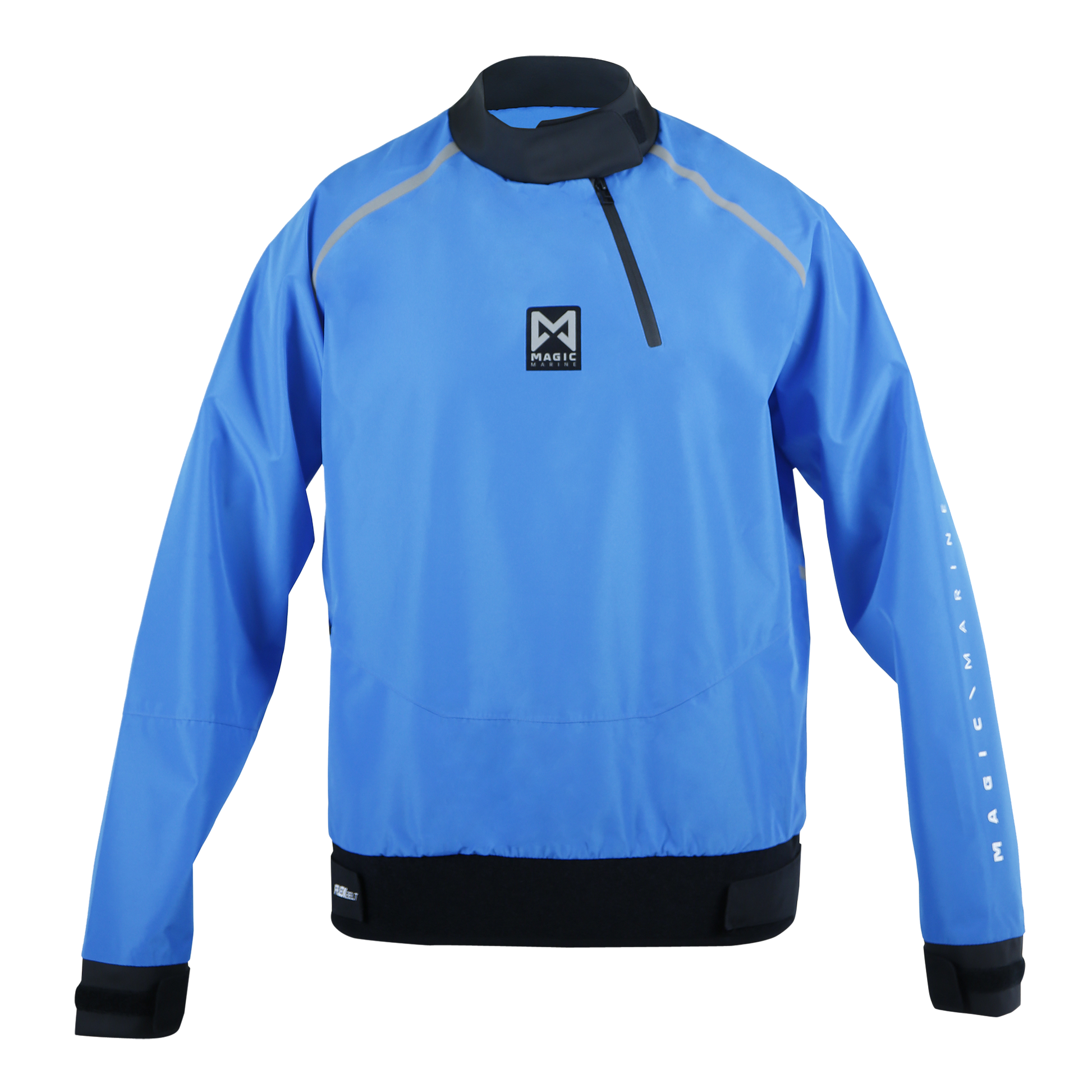 The PU wrist seals have an adjustable soft fabric hook and loop strap and can be made tight enough to stop most water ingress. Likewise the PU neck seal with hook and loop adjuster can be fitted tight to stop annoying dribbles or loose as comfortable, there is an off centre zipper with a waterproof gusset to allow for venting and to allow for the garment to go over the head. The waist is also sealable, this time the material is neoprene, which grips to the undergarment so as to minimise the potential for riding up, there is a soft fabric hook and loop adjuster which grips to the plush lining of the outer part of the waist band. Our outer fabric is unusually soft and very wearable, while still being durably waterproof. There are reflective darts on both the front and back for safety and a useful zipped pocket above the right hip.